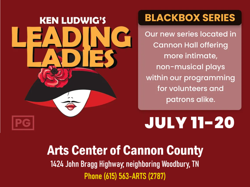 Fri-Sat 7:30PM / Sun 2PM (July 11-20, 2025) Arts Center of Cannon County in neighboring Woodbury, TN (1424 John Bragg Highway) presents Ken Ludwig's "LEADING LADIES". This hilarious comedy will be presented in the intimate black box theatre in Cannon Hall with General Admission Seating. It's the story of two English Shakespearean actors, Jack and Leo, who are down on their luck so they're performing “Scenes from Shakespeare” on the Moose Lodge circuit in the Amish country of Pennsylvania. For more information or to purchase tickets, phone (615) 562-ARTS (2787).