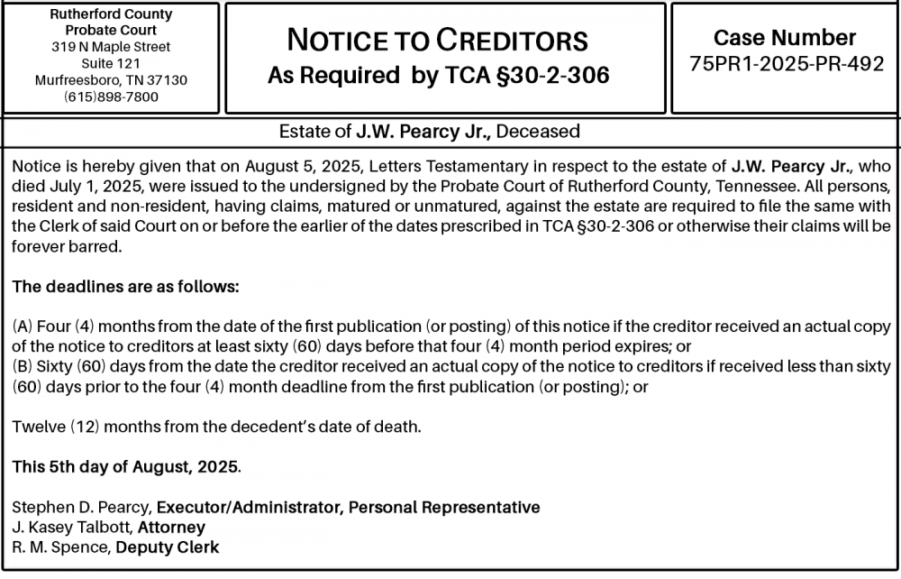 Notice is hereby given that on August 5, 2025, Letters Testamentary in respect to the estate of J.W. Pearcy Jr., who died July 1, 2025, were issued to the undersigned by the Probate Court of Rutherford County, Tennessee. All persons, resident and non-resident, having claims, matured or unmatured, against the estate are required to file the same with the Clerk of said Court on or before the earlier of the dates prescribed in TCA §30-2-306 or otherwise their claims will be forever barred.