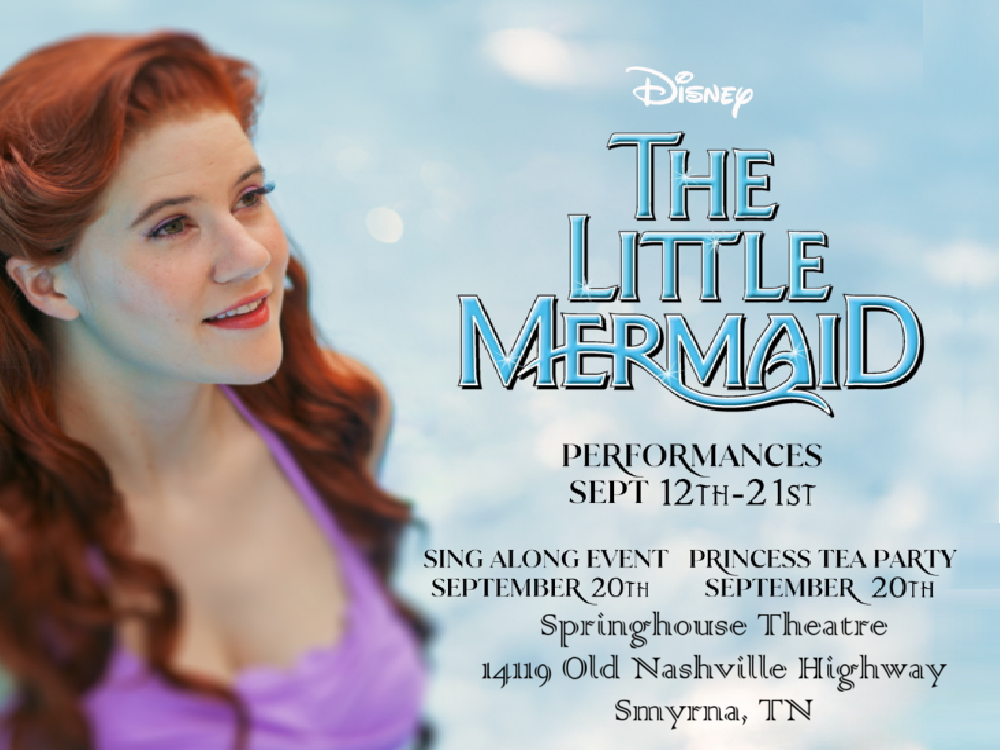 Fri-Sat 7:30PM / Sun 3:30PM (Sept. 12-21, 2025) Walt Disney’s “The Little Mermaid” at Springhouse Theatre Company, 14119 Old Nashville Highway, Smyrna TN. Follow Ariel, a curious mermaid with a voice as bold as her dreams, as she trades her fins for feet and a chance at life on land. (NOTE: Sat., Sept. 21 a bonus 2:30PM performance has been added). For more information or to purchase tickets on-line: https://springhousetheatre.com/springhouse-blackbox/