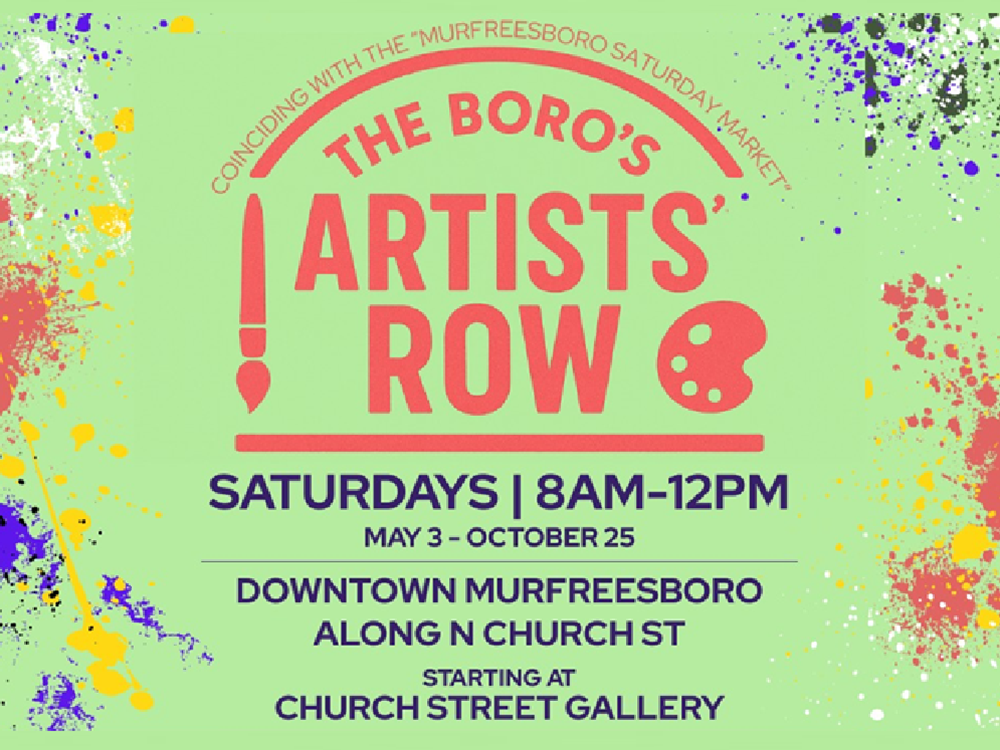 Sat. (May 3 - Oct. 25, 2025) 8AM-Noon ARTIST'S ROW on eastside of Historic Murfreesboro Square. See and purchase the works of local artists on the eastside of the historic Murfreesboro Square (starting at Church St. Gallery, 124 N. Church St.). This happens during the same time that Main Street Murfreesboro's SATURDAY MARKETPLACE is taking place.
