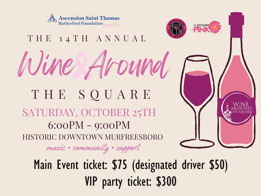 Sat. (Oct. 25, 2025) 6-9PM "WINE AROUND THE SQUARE" is a progressive wine and spirits-tasting event set around the historic Downtown Square in Murfreesboro. Proceeds support the Ascension Saint Thomas Rutherford Foundation’s Power of Pink program - Rutherford County’s premier fight against breast cancer such as funding mammograms, screenings, diagnostics, ultrasounds, and MRI scans as well as offering patient education, providing transportation and lodging for patients during treatment, and supplying life-saving equipment for those facing the most challenging circumstances. (Special thanks to Stones River Total Beverages) CLICK here for sponsorship and ticket information.
