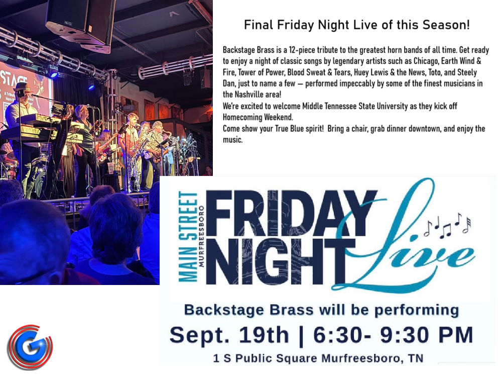 Fri. (Sept. 19, 2025) 6:30-9:30PM Main Street Murfreesboro's final FRIDAY NIGHT LIVE of the season. Enjoy tribute band BACKSTAGE BASH. This is also the beginning of MTSU's Homecoming Weekend. Bring your lawn chair and meet your fiends. It's all FREE!