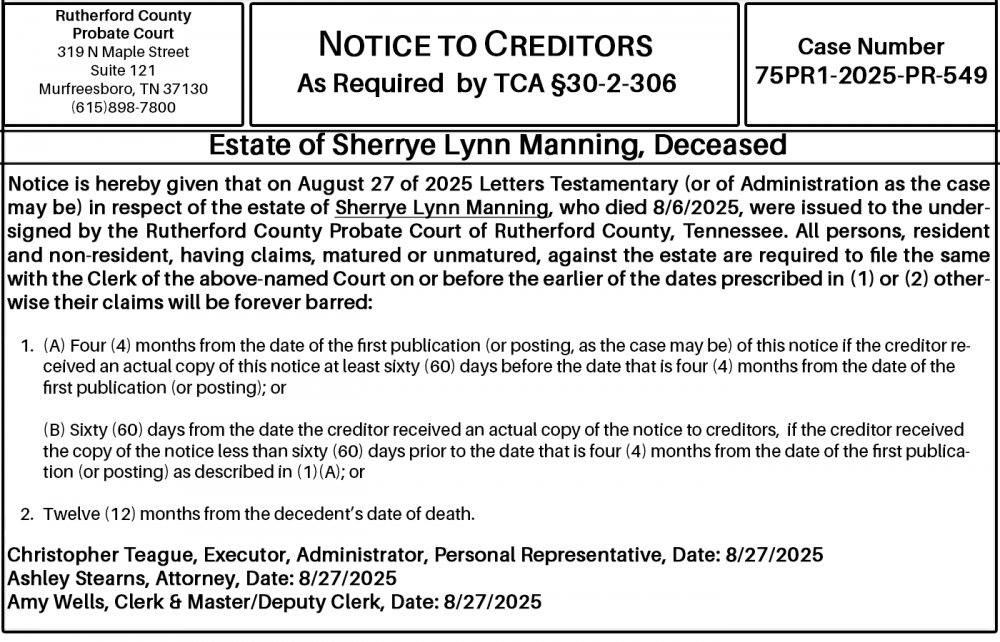 Notice is hereby given that on August 27 of 2025 Letters Testamentary (or of Administration as the case may be) in respect of the estate of Sherrye Lynn Manning, who died 8/6/2025, were issued to the undersigned by the Rutherford County Probate Court of Rutherford County, Tennessee. All persons, resident and non-resident, having claims, matured or unmatured, against the estate are required to file the same with the Clerk of the above-named Court on or before the earlier of the dates prescribed in (1) or (2) otherwise their claims will be forever barred: