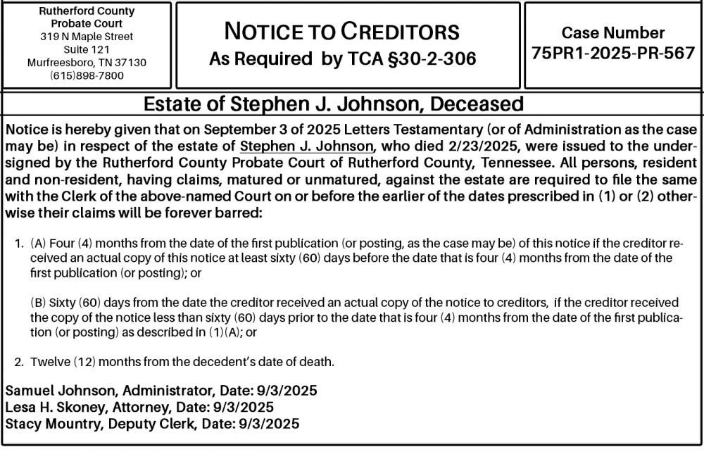 Notice is hereby given that on September 3 of 2025 Letters Testamentary (or of Administration as the case may be) in respect of the estate of Stephen J. Johnson, who died 2/23/2025, were issued to the undersigned by the Rutherford County Probate Court of Rutherford County, Tennessee. All persons, resident and non-resident, having claims, matured or unmatured, against the estate are required to file the same with the Clerk of the above-named Court on or before the earlier of the dates prescribed in (1) or (2) otherwise their claims will be forever barred: