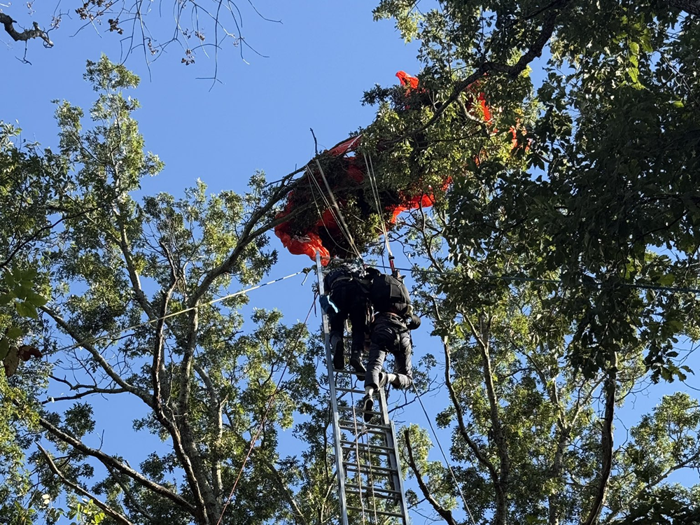 Around 4 o’clock Saturday afternoon, a Metro Police helicopter spotted the bright orange parachute tangled in the trees off the 4500 block of Ashland City Highway. Firefighters worked for hours to reach the man, eventually freeing him using ladders and a pulley system. He was alert and stable, though understandably shaken, and taken to a nearby hospital as a precaution.