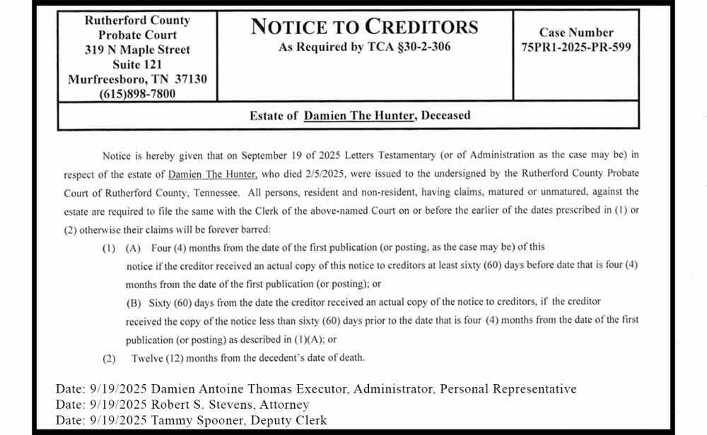 Notice is hereby given that on September 19 of 2025 Letters Testamentary (or of Administration as the case may be) in respect of the estate of Damien The Hunter, who died 2/5/2025, were issued to the undersigned by the Rutherford County Probate Court of Rutherford County, Tennessee. All persons, resident and non-resident, having claims, matured or unmatured, against the estate are required to file the same with the Clerk of the above-named Court on or before the earlier of the dates prescribed in (1) or (2) otherwise their claims will be forever barred: