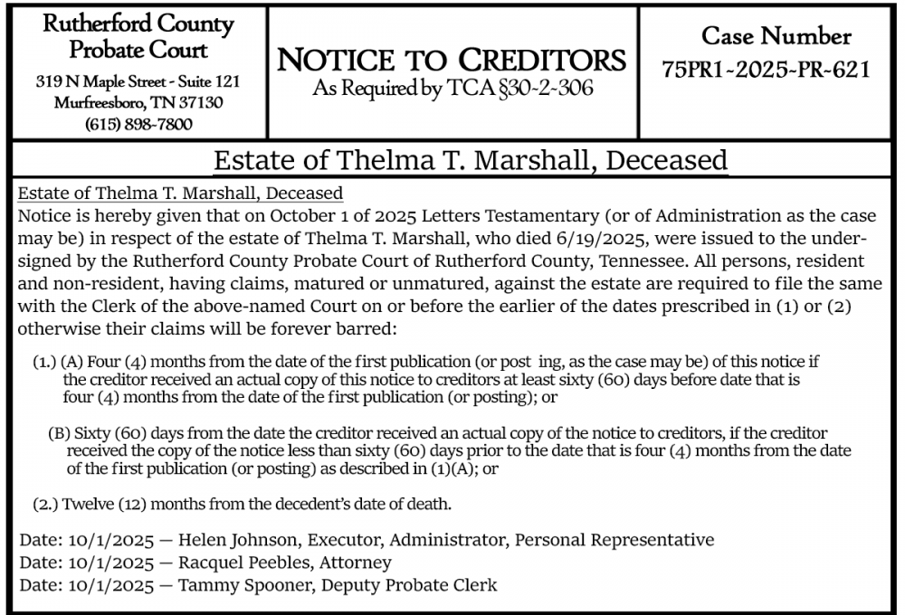 Notice is hereby given that on October 1 of 2025 Letters Testamentary (or of Administration as the case may be) in respect of the estate of Thelma T. Marshall, who died 6/19/2025, were issued to the undersigned by the Rutherford County Probate Court of Rutherford County, Tennessee. All persons, resident and non-resident, having claims, matured or unmatured, against the estate are required to file the same with the Clerk of the above-named Court on or before the earlier of the dates prescribed in (1) or (2) otherwise their claims will be forever barred: