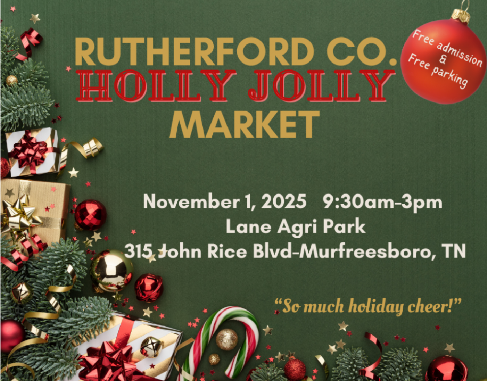 Sat. (Nov. 1, 2025) 9:30AM-3:00PM Holly Jolly Market at the Lane Agri-Park Community Center (315 John R. Rice Blvd, Murfreesboro). FREE admission and parking to an incredible array of talented local artisans and charming small businesses. Plus, a beautiful Christmas shopping bag for the first 35 to arrive. Take a break and enjoy lunch in the movie room while watching family-friendly Christmas movies.