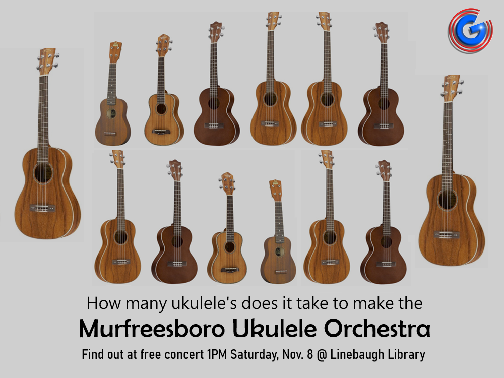 Sat. (Nov. 8, 2025) 1:00PM Murfreesboro Ukulele Orchestra with free concert in the Youth Services Story Room at the Linebaugh Public Library, 105 W. Vine St., Murfreesboro. The MUO Crew has carved out a niche in Middle Tennessee’s music scene by reimagining iconic tunes from the ’60s, ’70s, and ’80s. From Beatles harmonies to Jimmy Buffett’s beachy ballads and Van Morrison’s soulful classics, their setlists are a love letter to musical nostalgia—with a ukulele twist. It's all FREE!