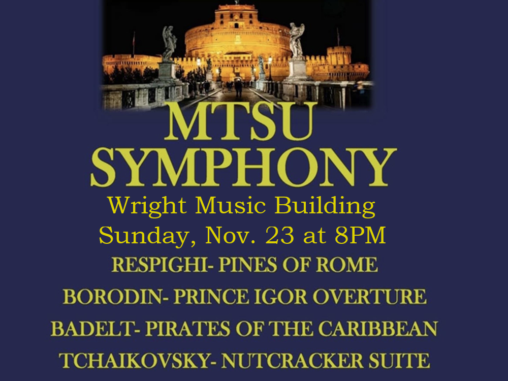Sun. (Nov. 23, 2025) 8PM MTSU Symphony in the Wright Music Building (1439 Faulkinberry Dr.). This concert is part of MTSU’s broader orchestral season, which also includes the High School Honors Orchestra. The concert includes Respighi – Pines of Rome, Borodin – Prince Igor Overture, Badelt – Pirates of the Caribbean, and Tchaikovsky – Nutcracker Suite (Trepak, Dance of the Reed Flutes, Waltz of the Flowers). Admission is FREE.