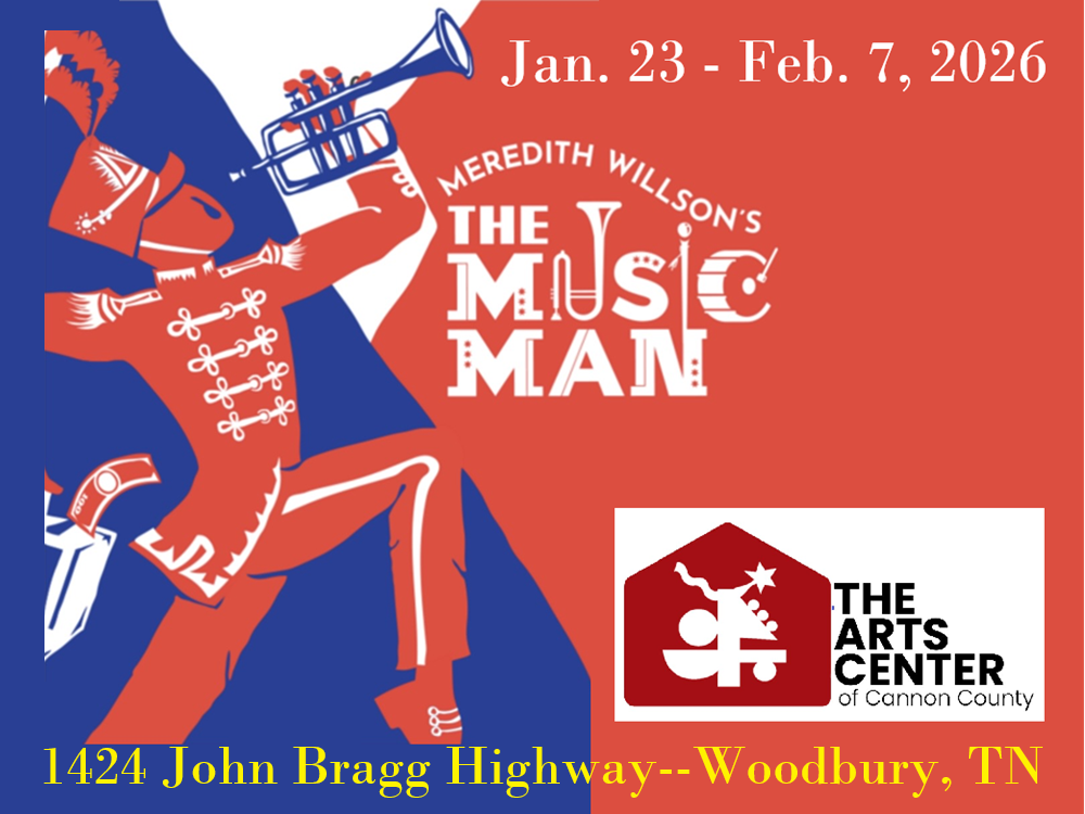 7:30PM Fri-Sat / Sun 2PM (Jan. 23 - Feb. 7, 2026) The Arts Center of Cannon County (1424 John Bragg Highway, neighboring Woodbury, TN) presents Meredith Wilson's "THE MUSIC MAN". The Music Man follows fast-talking traveling salesman Harold Hill as he cons the people of River City, Iowa into buying instruments and uniforms for a boys' band he vows to organize - this despite the fact he doesn't know a trombone from a treble clef. His plans to skip town with the cash are foiled when he falls for Marian the librarian, who transforms him into a respectable citizen by curtain's fall. For more information or to purchase tickets, phone (615) 563-ARTS (2787).