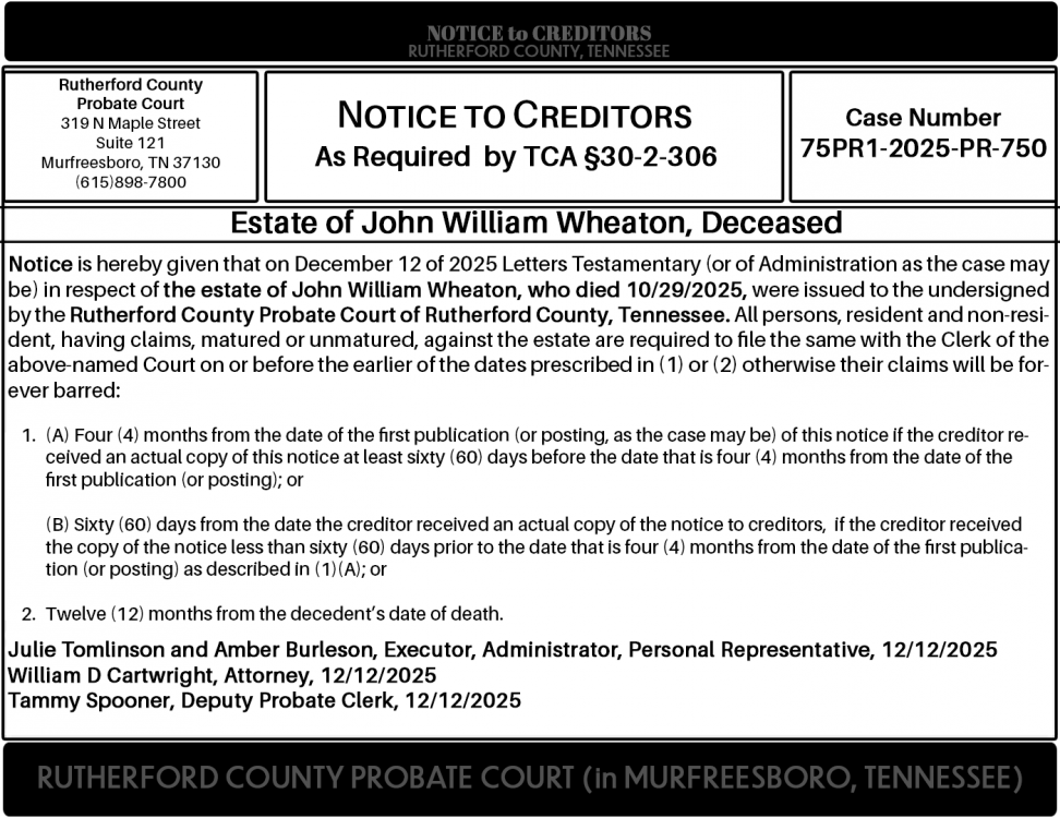 Notice is hereby given that on December 12 of 2025 Letters Testamentary (or of Administration as the case may be) in respect of the estate of John William Wheaton, who died 10/29/2025, were issued to the undersigned by the Rutherford County Probate Court of Rutherford County, Tennessee. All persons, resident and non-resident, having claims, matured or unmatured, against the estate are required to file the same with the Clerk of the above-named Court on or before the earlier of the dates prescribed in (1) or (2) otherwise their claims will be forever barred: