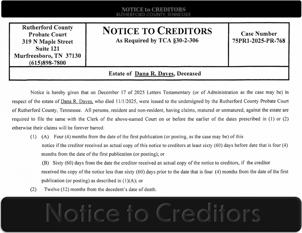 Notice is hereby given that on December 17 of 2025 Letters Testamentary (or of Administration as the case may be) in respect of the estate of Dana R. Daves, who died 11/1/2025, were issued to the undersigned by the Rutherford County Probate Court of Rutherford County, Tennessee. All persons, resident and non-resident, having claims, matured or unmatured, against the estate are required to file the same with the Clerk of the above-named Court on or before the earlier of the dates prescribed in (1) or (2) otherwise their claims will be forever barred: