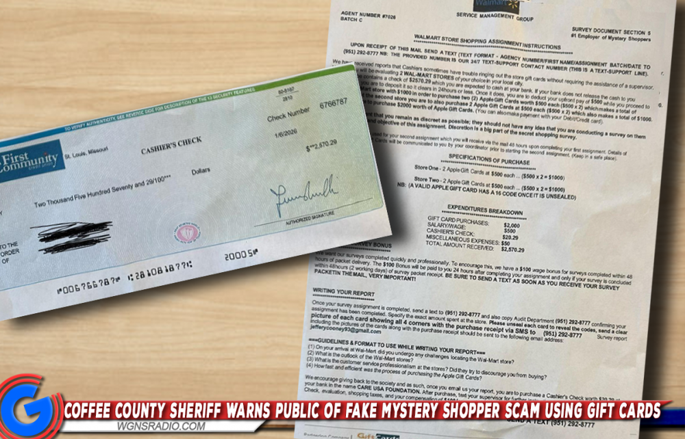 COFFEE COUNTY, Tenn. — The Coffee County Sheriff’s Department is warning the public about a fraudulent “mystery shopper” scam after residents reported receiving official-looking letters and cashier’s checks instructing recipients to purchase gift cards and send payment details to unknown individuals.