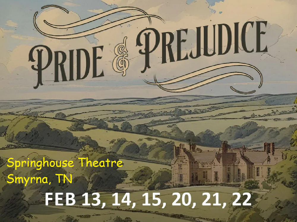 Fri-Sat 7:30PM / Sun 3:30PM (Feb. 13-22, 2026) The Springhouse Theatre (14119 Old Nashville Highway, Smyrna TN) presents “Pride and Prejudice”. Pride and Prejudice follow the spirited Elizabeth Bennet as she navigates family expectations, social class, and the complicated charm of Mr. Darcy. The story blends wit and romance while poking at the rigid norms of early 19th century English society. At its heart, it’s about learning to see past first impressions and discovering love through humility and growth. Reserve tickets on their website: http://springhousetheatre.com. The lobby opens 1 hour prior to showtime. For more information, phone (615) 852-8499.