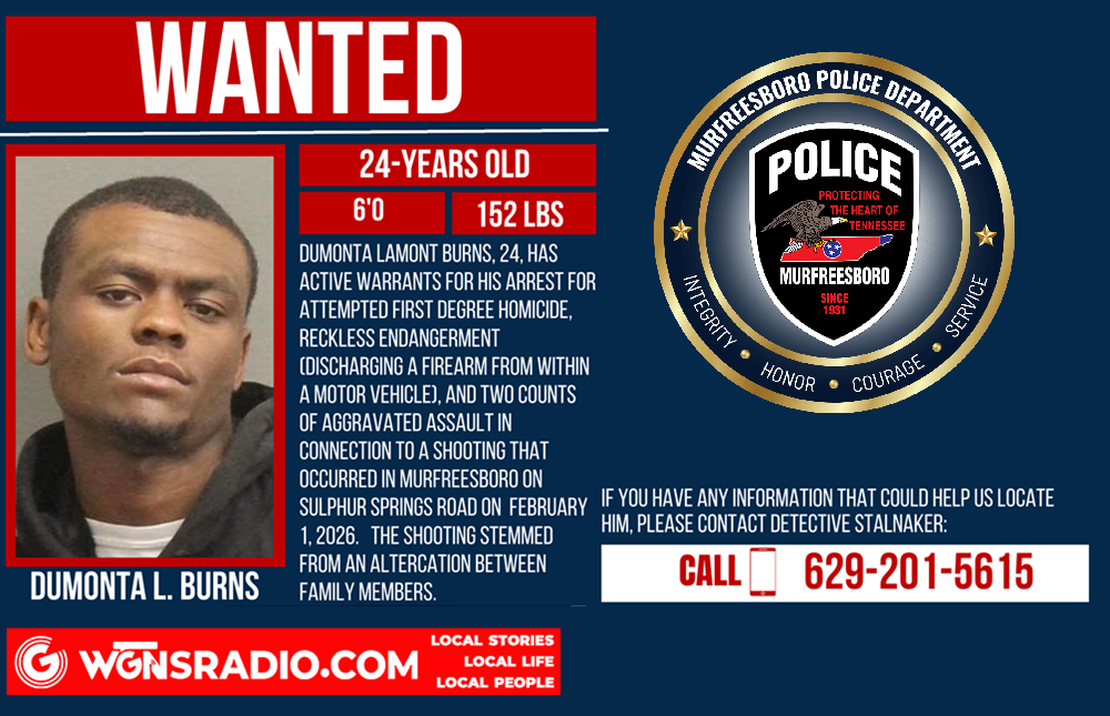 MURFREESBORO, TN (WGNS) - Murfreesboro Police are asking for the community’s help in locating 24‑year‑old Dumonta Lamont Burns, who investigators say is wanted in connection with a shooting on Sulphur Springs Road last Sunday (02/01/2026).