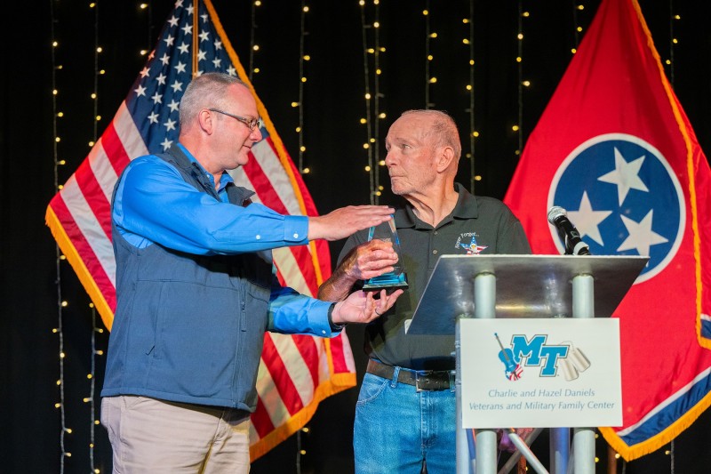 Trey Nunley, left, presents the 35th annual Joe Nunley Sr. Distinguished Service Award, named in honor of his grandfather, to Bill Kampbell, of Murfreesboro, Tenn., during the 43rd Salute to Veterans and Armed Forces memorial service on Saturday, Nov. 8, in the Keathley University Center Theater on the Middle Tennessee State University campus. (MTSU photo by James Cessna)