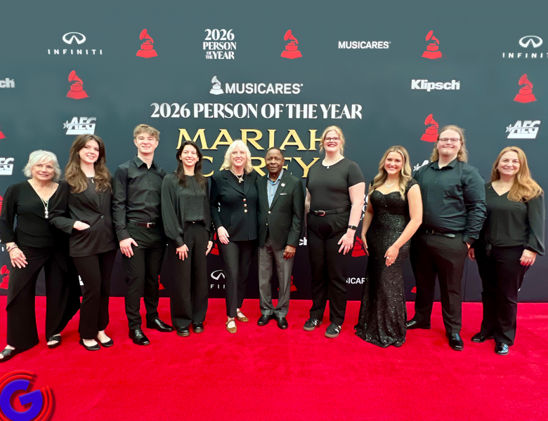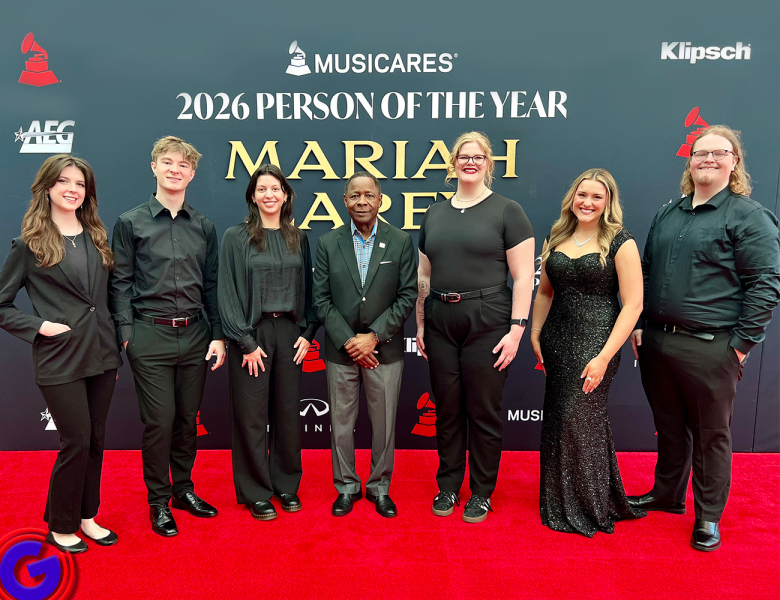 Students from MTSU’s Scott Borchetta College of Media and Entertainment are seen here at the Grammy Premiere Ceremony in Los Angeles, Cali., on Feb. 1, 2026. Shown from left to right are students Chandler Furr, Jenene Grover, Anna Shinholster and Emily Eastep. (MTSU photo)
