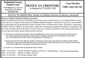 NOTICE TO CREDITORS: Estate of William Michael Faulkner, Deceased